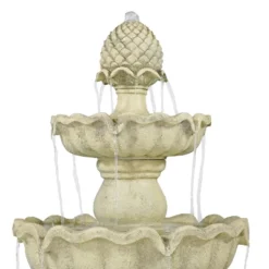 Add classic charm and elegance to any garden, patio, or yard with this beautiful electric fountain. The three-tier masterpiece will be a great addition to any outdoor space with its wide lower bowl, detailed edges, stand, and tiers, whimsical and relaxing waterfall sounds, and a beautiful, bubbling pineapple at the very top! Plus, the fountain stands over 4′ so it is sure to impress family and friends as it adds soothing running water sounds to the atmosphere. Place between tall bushes or flowerbeds for a beautiful landscaping accent. Or, add this fountain to your patio, deck, yard, or garden to add a relaxing, elegant, and grand focal point to any space. It also features an electric pump that plugs into a standard electric outlet that allows the water to circulate from the top tier through the bottom basin and back upwards again. When placed in the preferred location, fill the bottom bowl, plug in the pump, and watch the new fountain transform your outdoor space.
