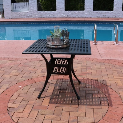 Add classic flair to the backyard space with this 35″ cast aluminum dining table. This outdoor square patio table offers flattering designs on the tabletop and legs that is sure to impress all guests. This table boasts an elegant cube pattern to effortlessly complement any existing modern or contemporary outdoor home aesthetic. Made from durable, weather-resistant cast aluminum material, this outdoor patio table is sure to last for many years to come. The 2″ diameter umbrella hole allows an umbrella to be added to the table to provide shade while unwinding and enjoying this table (umbrella not included). Create a comfortable and classy place to unwind at the end of a long day outdoors with this beautiful, strong, and sturdy patio table. Invite friends and family over for tea, brunch, or create an effortless conversation piece for your space. Add chairs for an easy bistro set as well (chairs are not included).