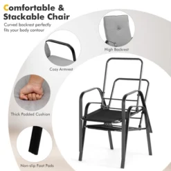 - Stackable Chairs with Cushion: With curved armrests and cozy backrest, the 4 chairs will provide a perfect place for you to sit. Each chair is equipped with a high back cushion which is filled with high-density sponge for extra softness. Moreover,the anti-skid footpads protect the ground from scratches well. Each chair can load up to 330 lbs. Additionally,when not in use,the four chairs can be stacked together after the cushions are detached for space-saving storage.