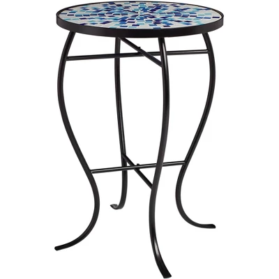- Blue mosaic inlay top. Black finish metal construction. Gracefully curved legs.