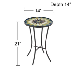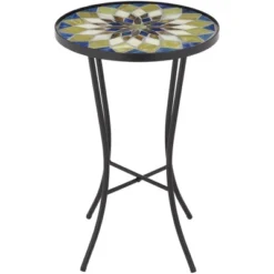 No matter where these outdoor accent tables are situated, feel like a flower garden exists with the petal mosaic design. From the Teal Island Designs brand, the black finish iron frame holds up the multicolor top in a multicolor petal mosaic design. Place these tables on a patio or porch area for easy use.