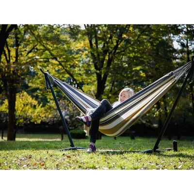 This gray and gold striped hammock and steel stand set is the perfect way to relax in style in your own backyard today! Read a book, take a nap or have a drink while swaying in the warm breeze this summer with this set. Order your hammock set today for an easy way to relax under the warm sun with the people you love this summer!Features:Gray and gold striped hammock and steel stand set The bed length is 87”Assembly required for the stand- hardware needed for assembly is includedThis hammock can hold 2 peopleCan be used indoors or outdoors Weight capacity: 450 lbsDimensions: 41”H x 47”W x 110”LMaterial(s): steel, cottonNote: Set comes with 1 hammock and 1 hammock stand