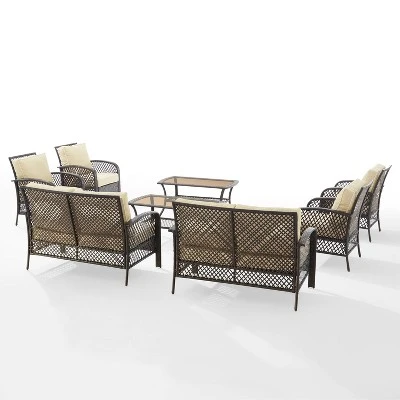 Gather friends and family for a day of relaxation with the Tribeca 8pc Conversation Set. With a unique lattice design, the loveseats, chairs, and coffee tables feature all-weather resin wicker over powder-coated steel frames. The seat cushions are covered in moisture-resistant dyed yarn polyester, while the glass tabletop coffee tables provide ample space for drinks and snacks. Offering exceptional flexibility with multiple seating and table options, the Tribeca conversation set can be arranged in a variety of ways to meet your entertaining needs.