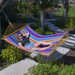 - The double wide hammock is made of soft, breathable cotton – the perfect summer relaxation spot.