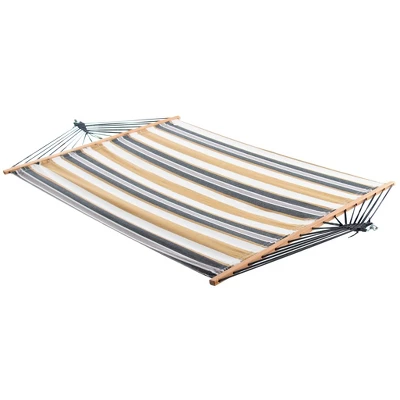 This single-layer cotton spreader bar hammock combines the comfort and breathability of a Vivere’s cotton hammocks with the beauty and functionality of a spreader bar hammock. Choose from Vivere’s top-selling hammock colours and patterns now available in a spreader bar hammock with a wood bar sealed and coated with marine stain. This hammock is easy to set up between two posts, trees or pair with one of Vivere’s large hammock stands. Easily roll and store the hammock during unpleasant weather.