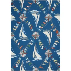 Set sail from the comfort of your home with this nautical indoor/outdoor rug from the Waverly Sun N’ Shade Collection. Its uniquely rendered trellis design features strings of flags that meet at compass points across its navy-blue ground, forming diamonds around a repeat sailboat pattern. Machine made of low-pile polyester, this striking design gives your patio, deck, porch, or yard coastal appeal.