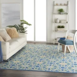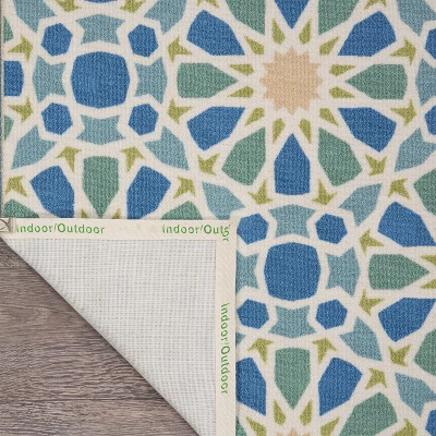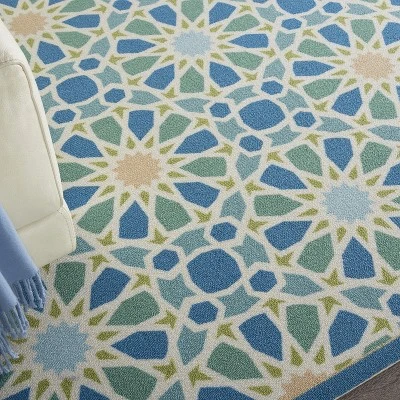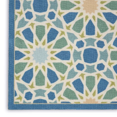 In light-filled spinning shades of jade, marine blue, sky, porcelain and citrine, flashing sun bursts swirl and twirl to charismatically create this magnetic Moroccan tile-inspired Starry Eyed runner rug by Waverly for Nourison.