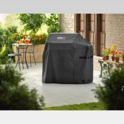 Embrace the pouring rain, freezing snow, and scorching sun. The lightweight yet durable Weber Premium Grill Cover makes it easy to pull on and off your grill. Its fastening straps keep it from blowing into your neighbor’s yard, and water-resistant material helps maintain a clean, sleek surface. The all-weather 100% polyester fabric helps keep your grill safe from the elements. Fits Spirit II 300 series, Spirit 300 series and Spirit 200 series (with side mounted controls). Covers should be spot cleaned only, not machine washable.