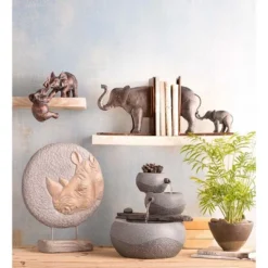 Soothe your senses with this serene Lighted Three-Tier Indoor Fountain. Designed to resemble cast stone and wood, this resin fountain features a light in the lower basin that creates a warm glow in the evening. As the water trickles down from the small to the medium and finally the large basin, the sound of flowing water resonates and calms. Accented with a faux wooden board, rock and flowers in the top bowl. The electric pump operates on a standard electric cord. For indoor use only.
